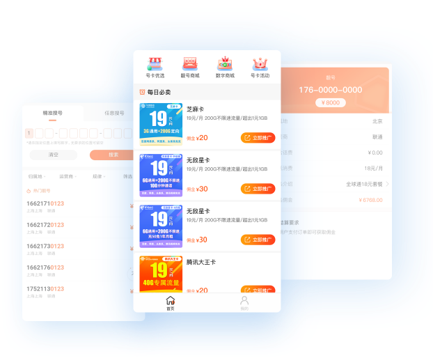 一、二级代理均可对商品加价销售,可生成专属小店推广号卡、靓号等多类产品